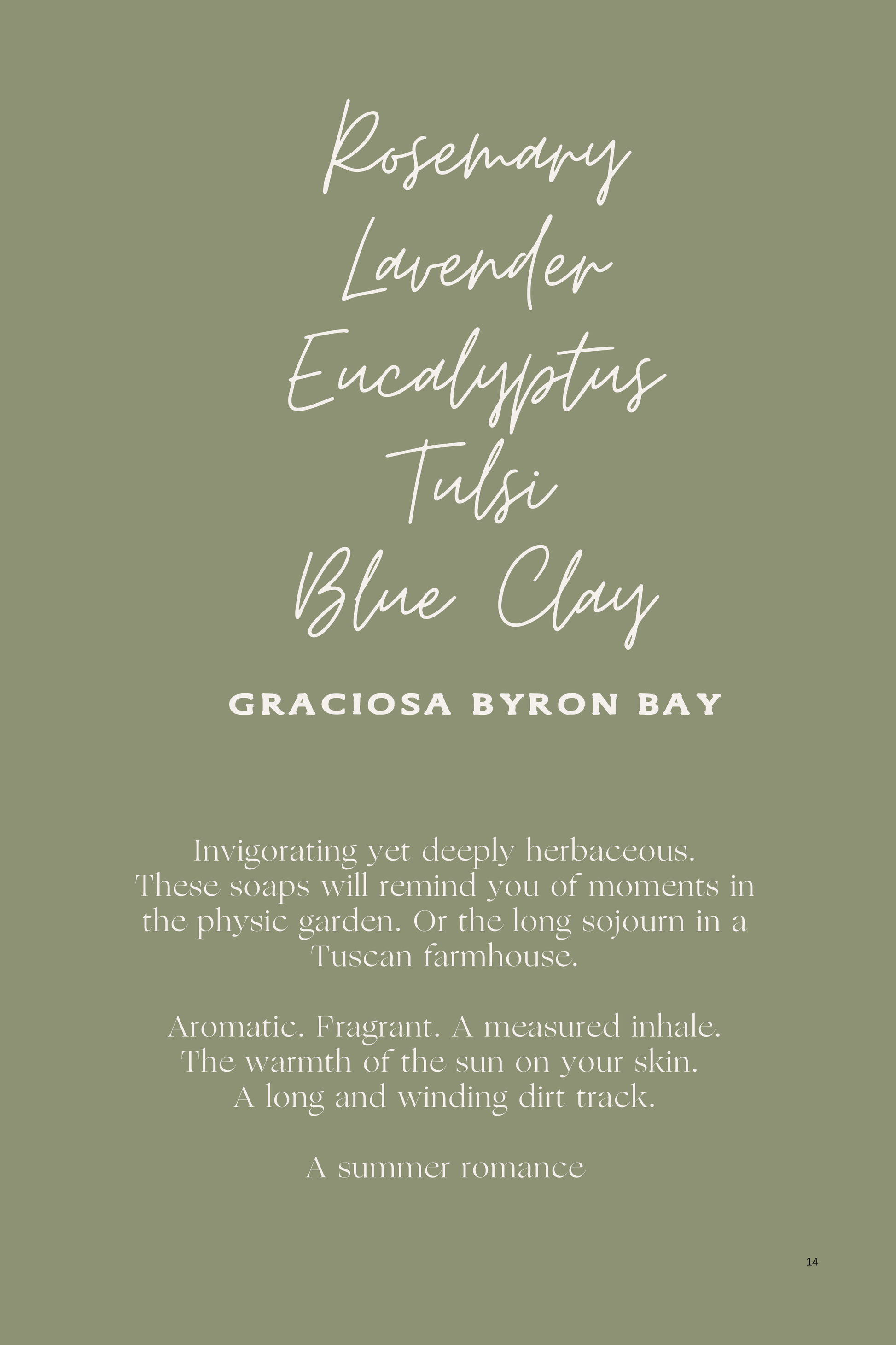 Our Rosemary, Lavender, Eucalyptus and Tulsi Soap Bar combines blue clay for an invigorating and detoxifying cleanse. Deeply herbaceous, aromatic and nurturing. Our 100% essential oil blend is luxurious in an earthy, connected to self kind of way. Rosemary is the hero scent here and in our garden. A powerful purifier, it cleanses the air, balances the spirit and clears away impurities. Each of our Rosemary based soap has unique markings that make them truly one-of-a-kind. And a little pre-historic in nature.